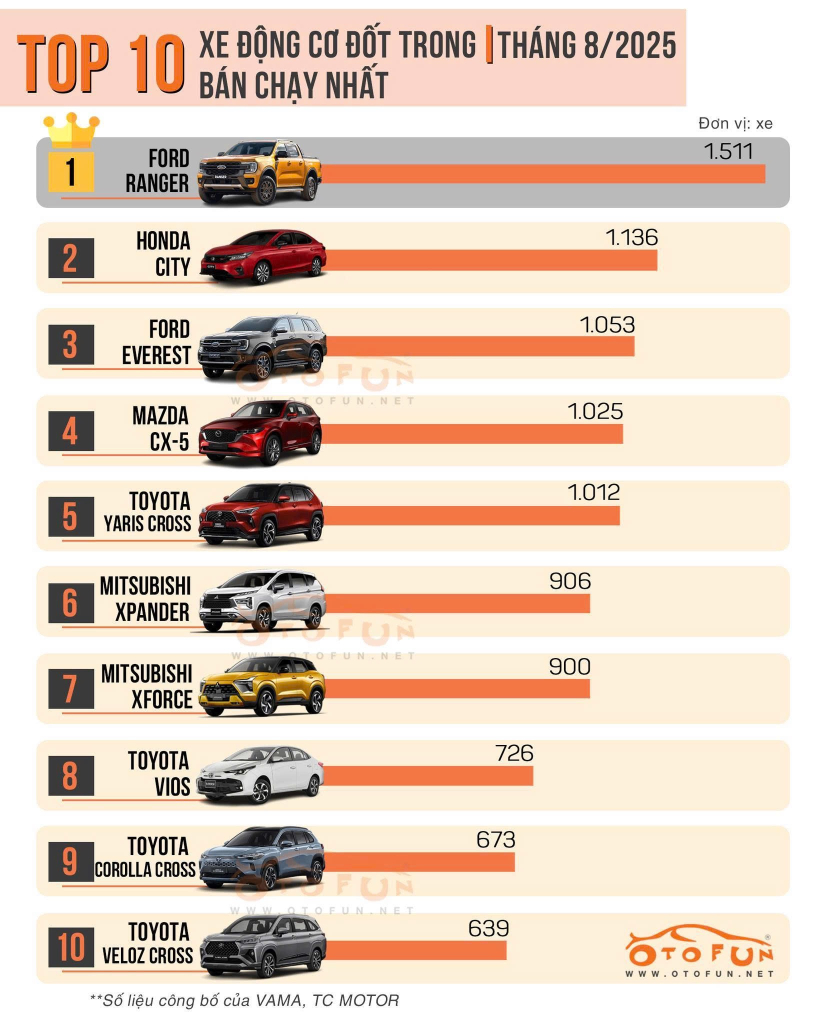 Theo số liệu công bố mới nhất từ VAMA và TC Motor, tháng 8/2025 tiếp tục đánh dấu một cột mốc ấn tượng của Ford tại thị trường Việt Nam. Không chỉ có một mà tới hai mẫu xe Ford cùng lúc góp mặt trong Top 3 xe động cơ đốt trong bán chạy nhất, chứng minh sức hút bền vững và vị thế vững chắc của thương hiệu Mỹ trên dải đất hình chữ S.